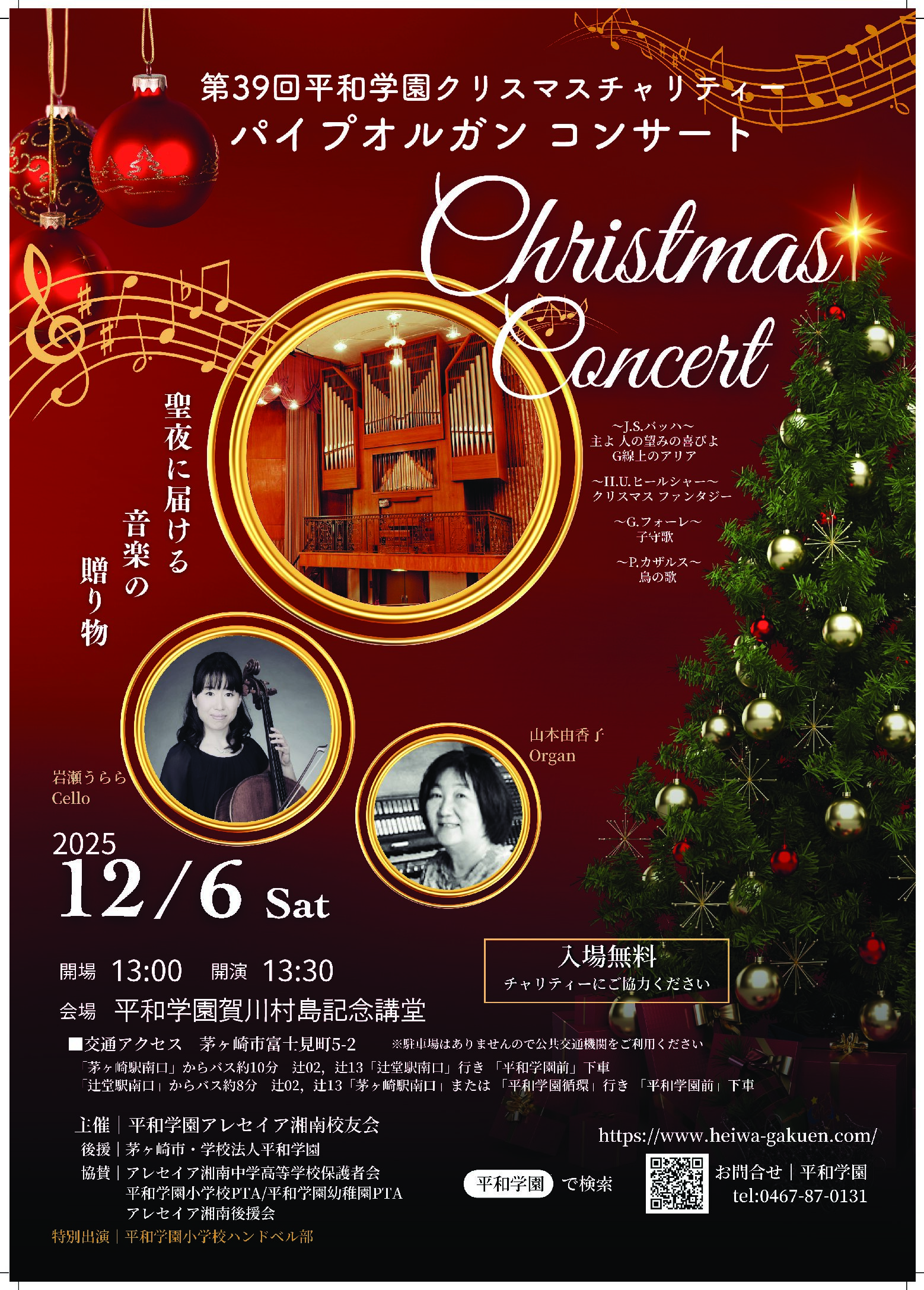 ~開催予定です~ 第39回 平和学園 クリスマスチャリティー パイプオルガンコンサート - 聖夜に届ける音楽の贈り物 - 日時:2024年12月6日(土) 13:30開演(13:00開場) 会場:平和学園賀川村島記念講…